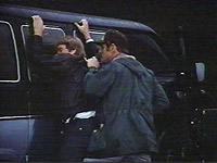 When the van they are driving pulls off the road, the brothers jump out to apprehend the dognappers. However, one of them has circled around and forces the Simons to drop their